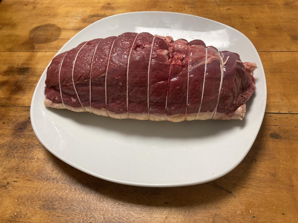 Rôti de magret (canard de Barbarie) fourré au foie gras. Environ 670 g